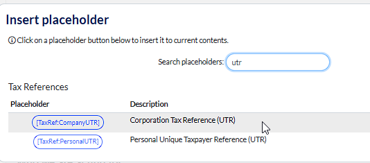 Example - using the placeholder UTR will pull through the Corporation Tax UTR that you’ve added to that specific client - ideal for sending out ‘accounts filed’ emails.