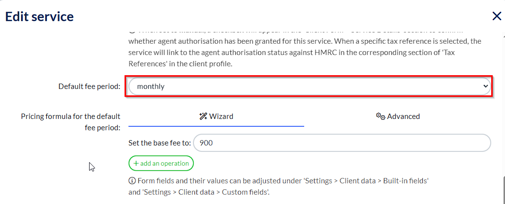 Scroll down to Default Fee Period - is this a service that we’re billing monthly, yearly, quarterly etc? We’re telling Engager when to expect payment from our client for our services.