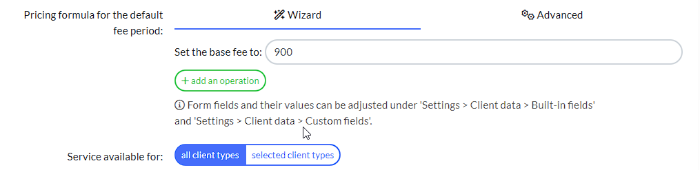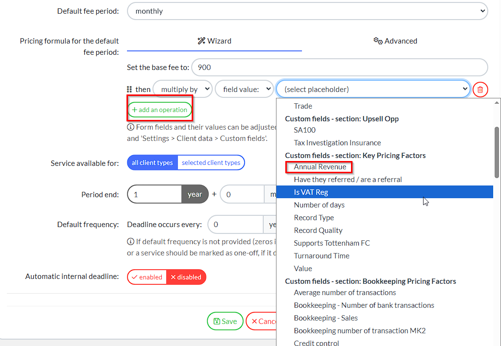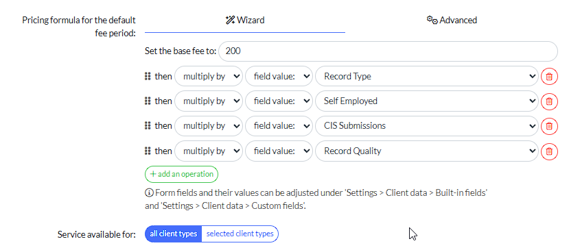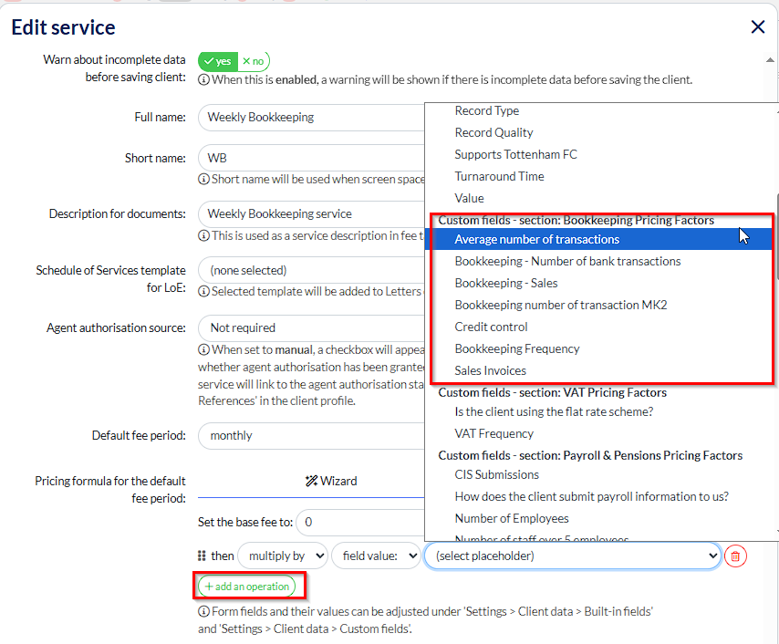 Once you’ve had a play with your Custom Fields, when you come back your pricing within the Service, you’ll see that you can select ‘Add an Operation’ then pull through your new Custom Fields to interact with - you can be as complicated as you like if you need to
