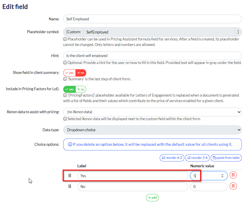 This is where you can start to program the behaviours that you want - so in this example, I want to charge 5 times the amount of my usual self assessment fee of £100, if they are self employed.