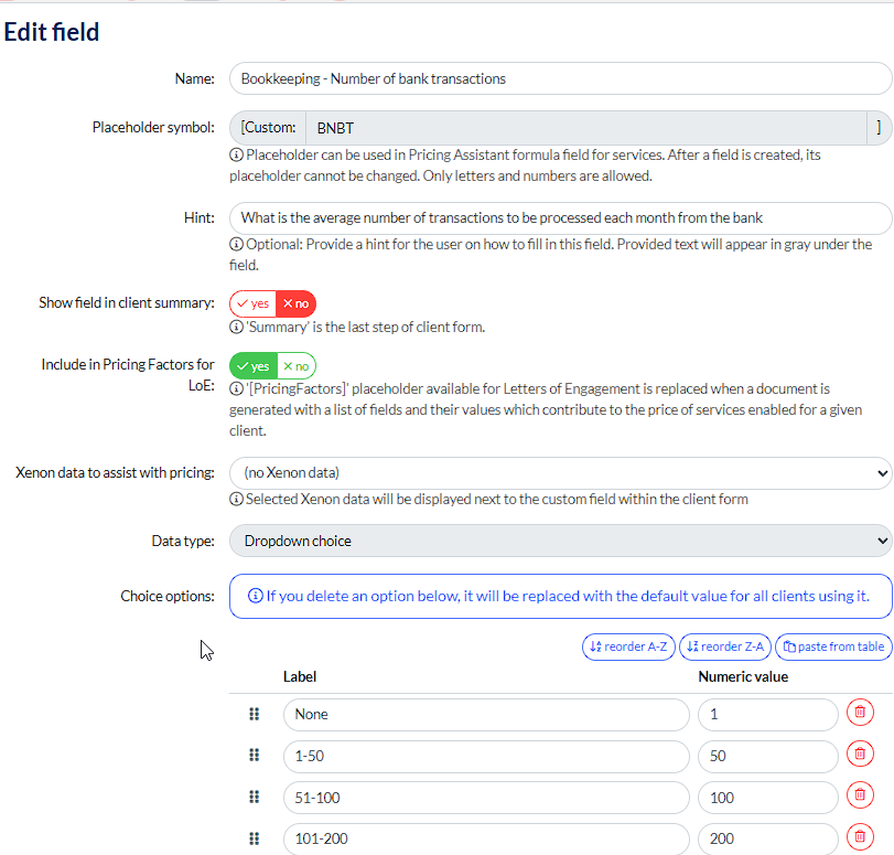You can also play with some of the data values and types too so if you wanted to have a scenario in Bookkeeping as an example, and wanted to charge the customer for an average number of transactions to reconcile per month, us the Whole Number value and the system will calculate accordingly.