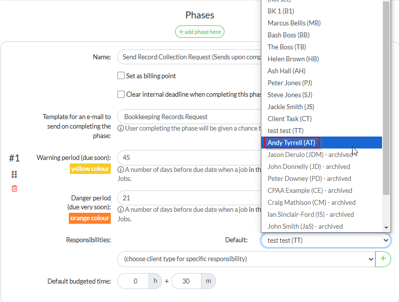 Scroll down to the Phases section and then check Responsibilities - Defaults - If that staff member appears, move to a different member of the team.