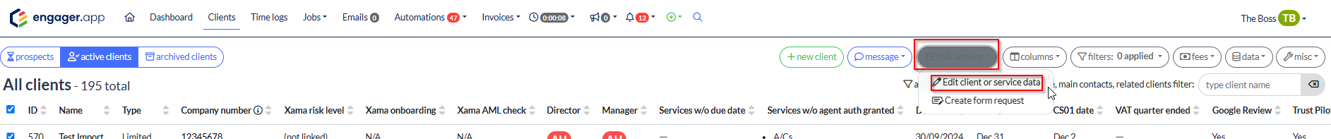 Head to Clients - Select All - Bulk Actions - Edit Client or Service Data