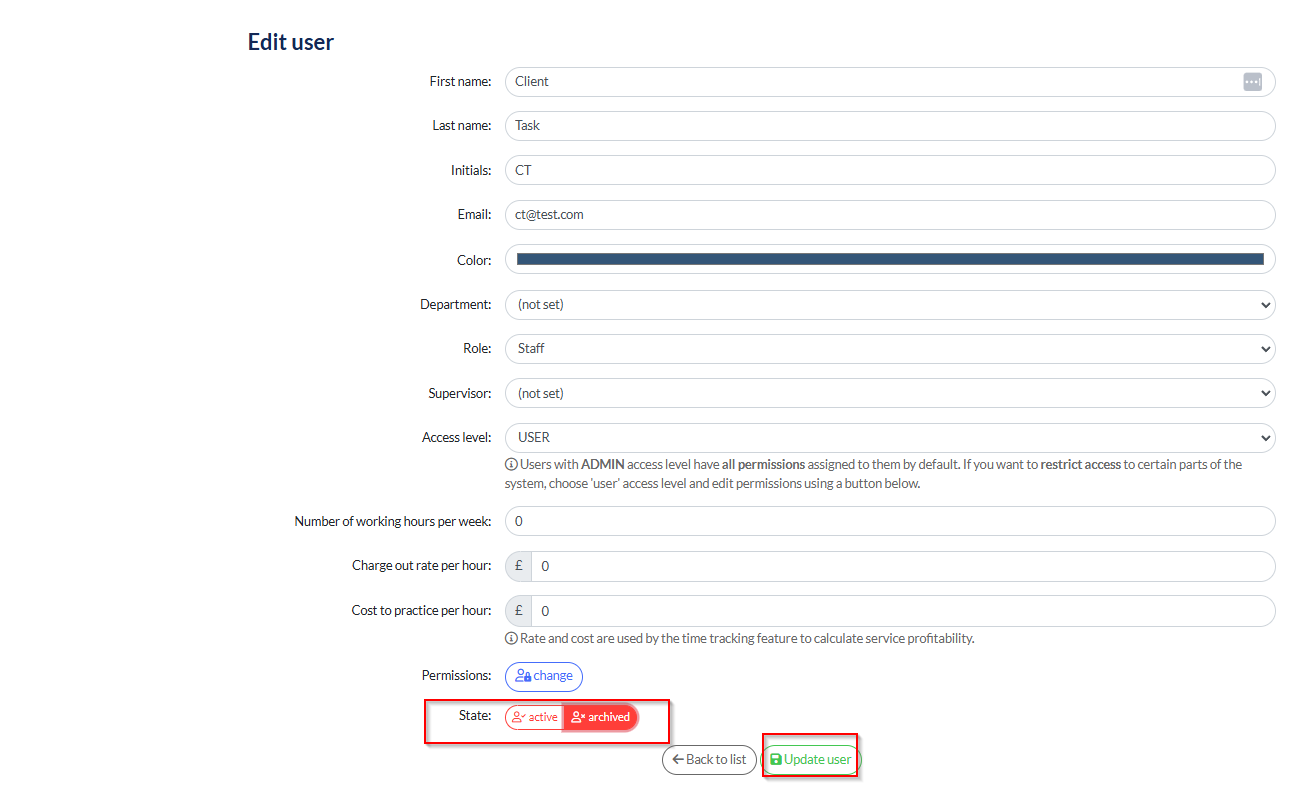You'll want to mark the change the STATE to Archived, not Active - please note that you cannot delete USERS, you can only archive.