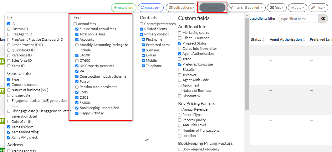 In the Clients view, select 'Columns' and then mark the fees required