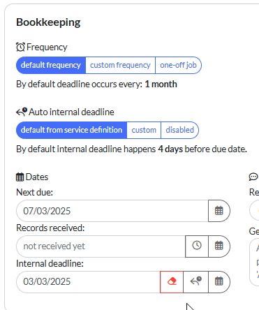 Using the example below, we have monthly bookkeeping - it will repeat each month and we'll aim to get completed by our INTERNAL DEADLINE which is 4 days before actual deadline - again, this is what you're about to set at the client level.