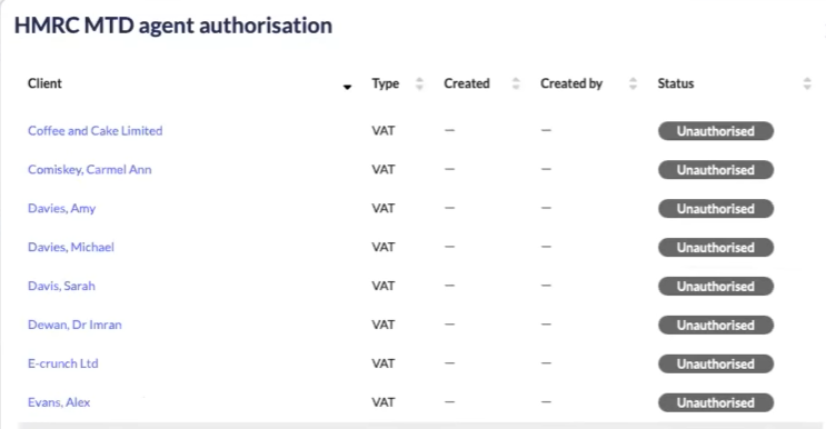 Letter-based HMRC Agent Authorisation and MTD widgets, will help you keep track of where you are with the requests, broken down by client,tax liability, who created the requested and when