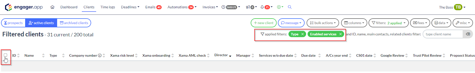 - Use the top-left checkbox to select all filtered clients.