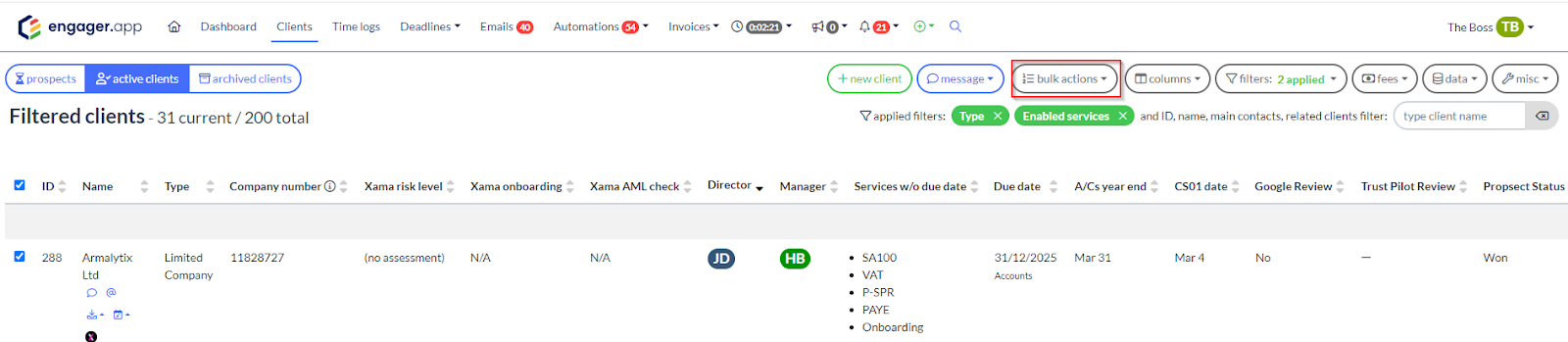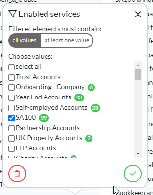 - Once your filters are applied, the list will display only clients with the Self Assessment service enabled.