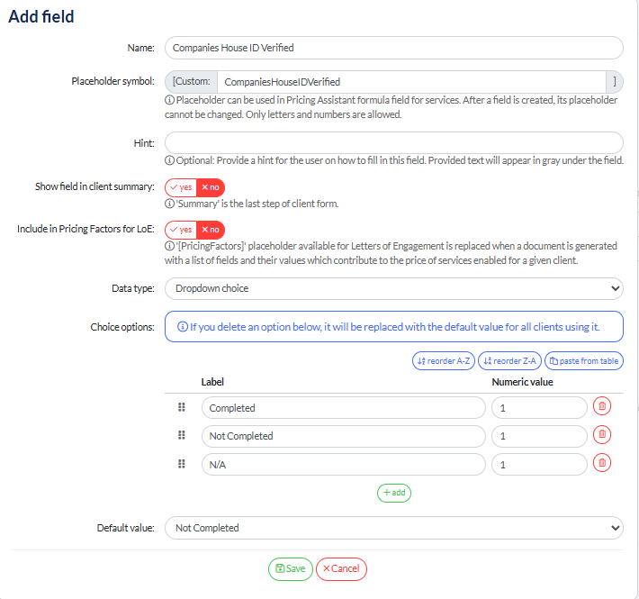 Then create the following with the name, the dropdown choice then the 3 options of Completed, Not Completed and Not Applicable (this will be for trusts / sole traders / non-LTD charities etc)