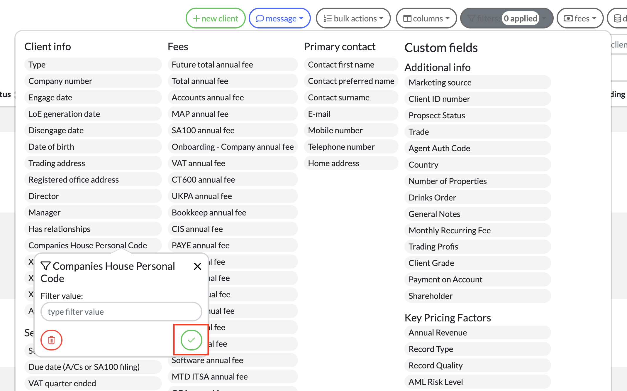 You can also filter by Companies House Personal Code. To filter on Empty Values simply select the filter, keep the Filter Value as empty, and then select the green tick.