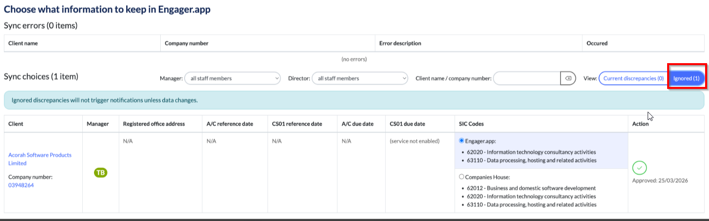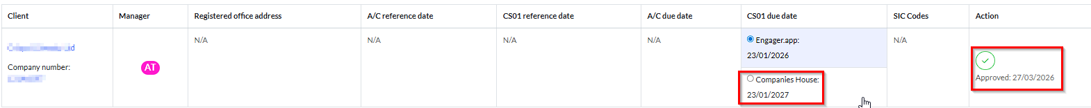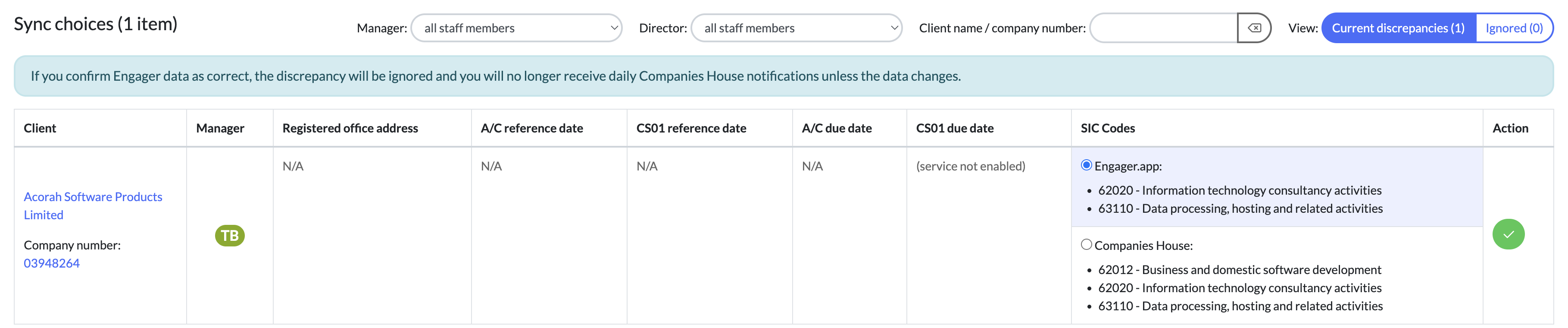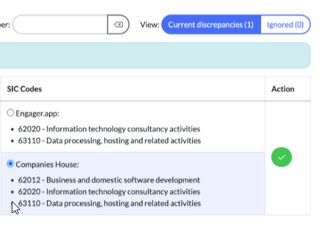 We'll display the Client and the relevant fields. It will be clear to see where there's a mismatch as you'll see the a button to select, for either Engager.app or Companies House.